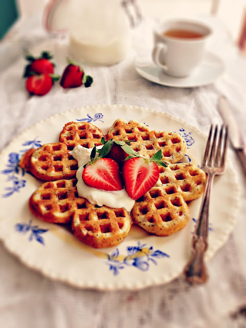 Die trockenen Zutaten in einer großen Schüssel vermengen. Die Buttermilch, zerlassene Butter, das Ei, die Zitronenschale, den Zucker und die Vanille in in einer weiteren Schale verrühren und mit den trockenen Zutaten zusammen schütten. Mit dem Handrührer gut verkneten und 30 Minuten ruhen lassen.Die Waffeln dann nach Anweisung des Waffeleisens backen.